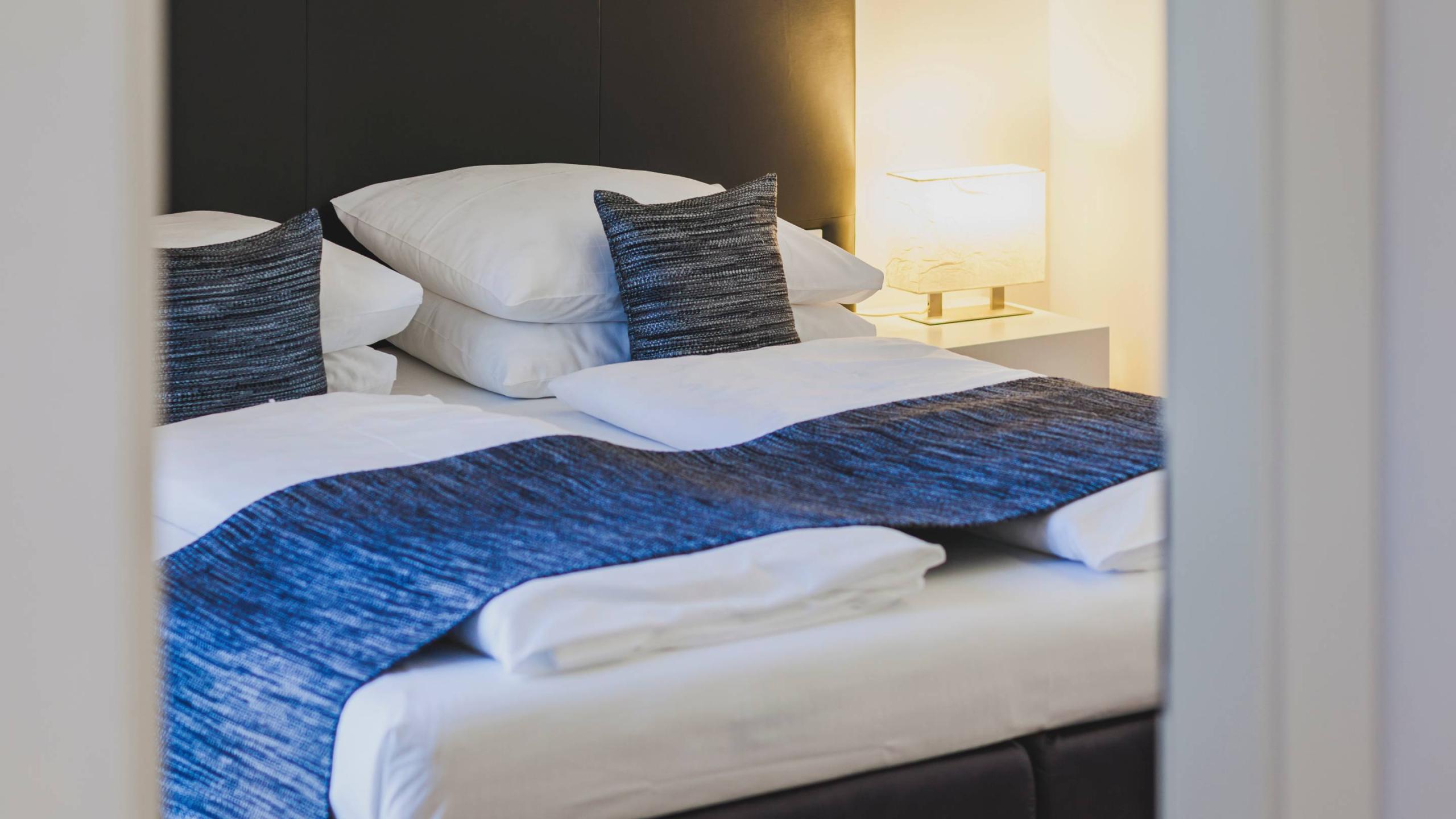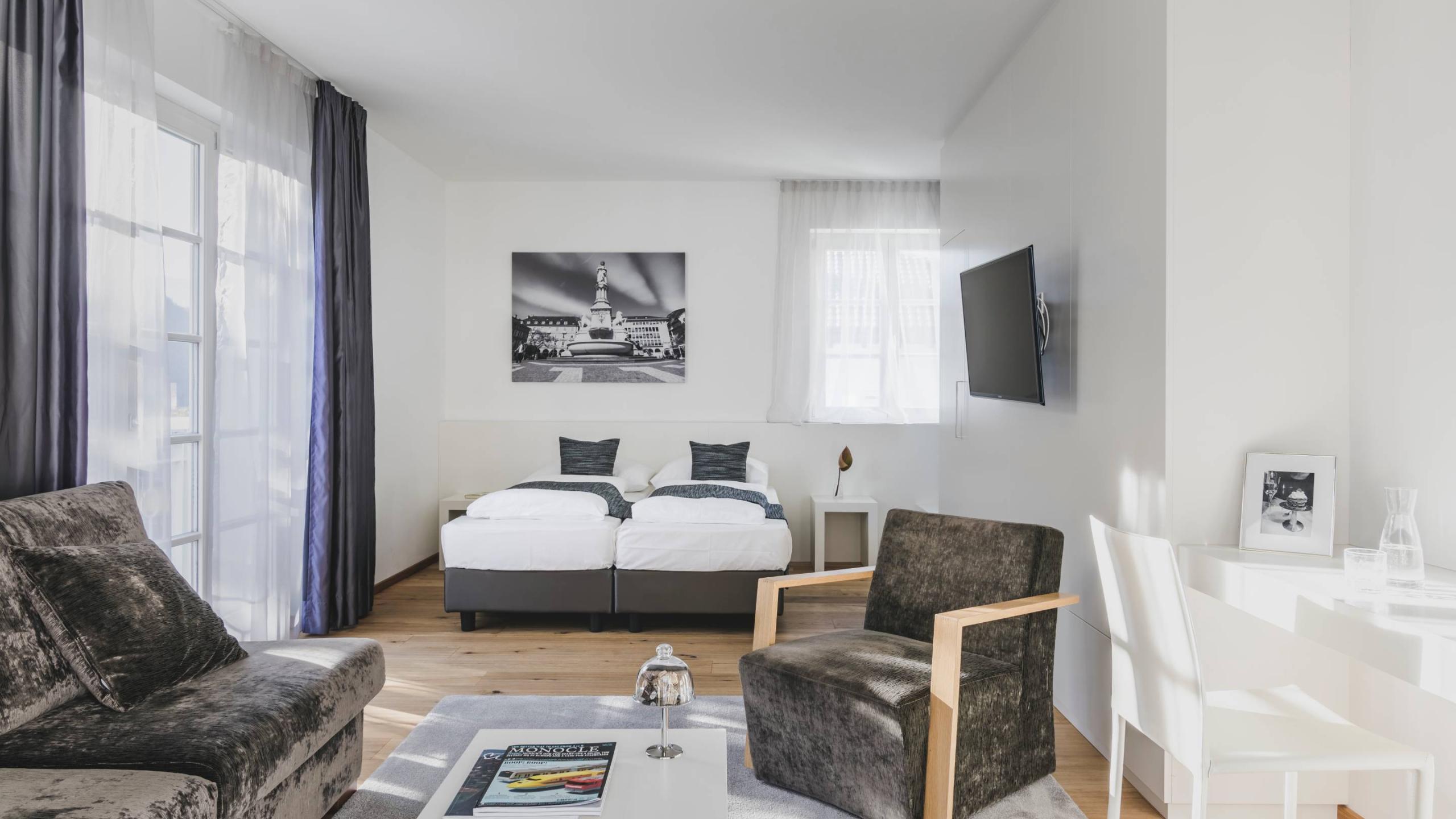 King-size bed (190x200cm), two single beds or a double bed in the separate living area, modern furnishings, high-quality wooden floor, balcony or window, large mirror, desk, air conditioning and individually controlled heating, minibar, non-smoking room with smoke detector, safe