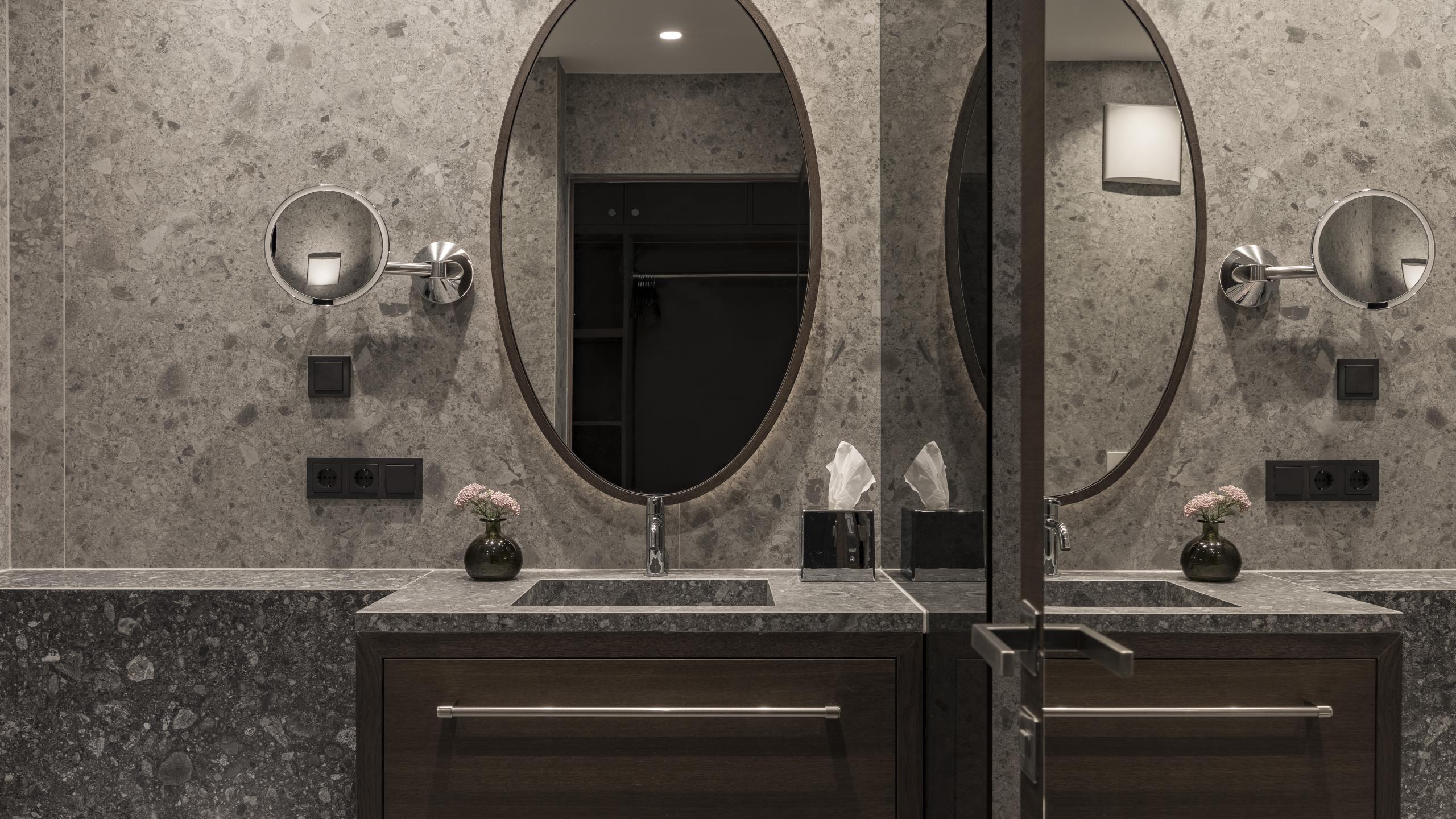 Bagno con doccia e bidet, prodotti selezionati di alta qualità, set di prodotti da bagno, asciugacapelli.